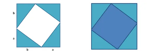 Now we’ve taken the big square and put our four triangles into it in two different configurations; but this clearly doesn’t affect the area of any of the shapes involved so the area of the “gaps” between the triangles in both pictures must be equal as well: