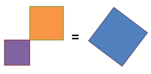 Now this isn’t the only way to take four triangles like this and place them inside a square with side length : instead we could arrange them around the outside of the square, touching “tip to tip” and leaving a whole in the middle, which turns out to be a square of side length (question to think about: why is it not a rhombus?)