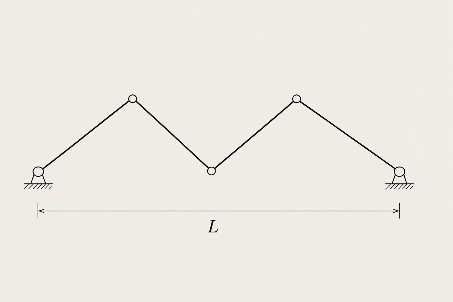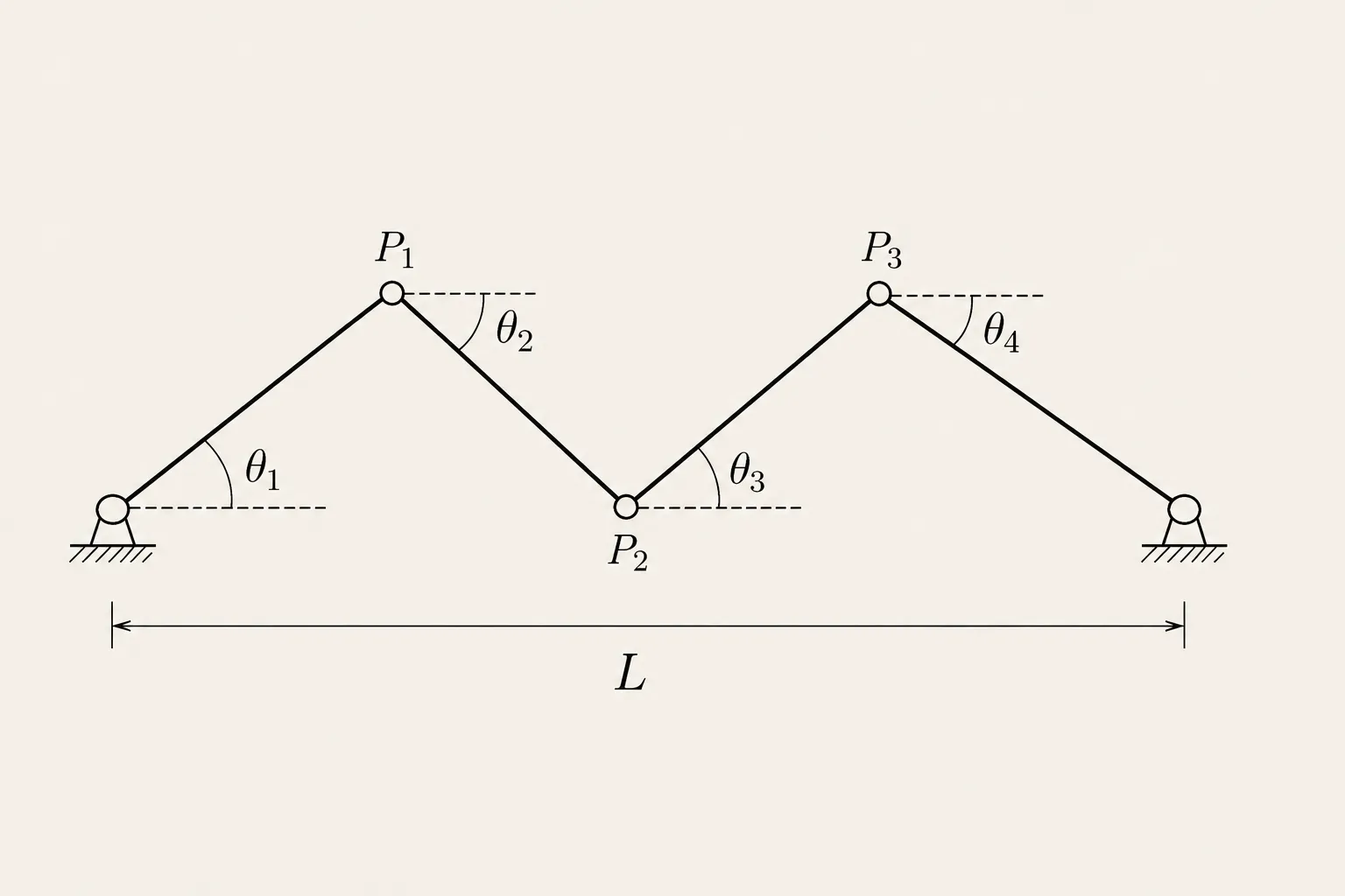 We work with a chain of unit rods hinged end-to-end in the plane, with both endpoints pinned a distance apart. Label the chain’s vertices , set by convention, and treat the remaining vertices as our variables. Two conditions govern them: each rod has unit length, for , and the chain is pinned at the far end, . So our configuration space is: