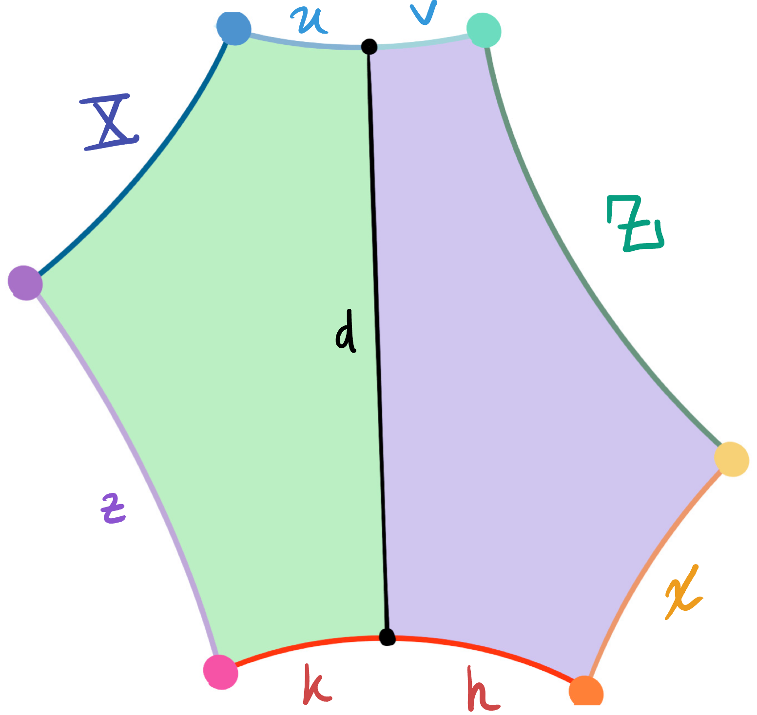 $$\cosh h = \sinh Z\sinh v \hspace{1cm}\cosh k = \sinh X \sinh u$$$$\sinh h\sinh x = \cosh v \hspace{1cm}\sinh k\sinh z = \cosh u$$We do not know the values of $X$ or $Z$, but we can again use the trigonometry of right angled pentagons to write their hyperbolic sines in terms of known quantities, and the perpendicular $d$: